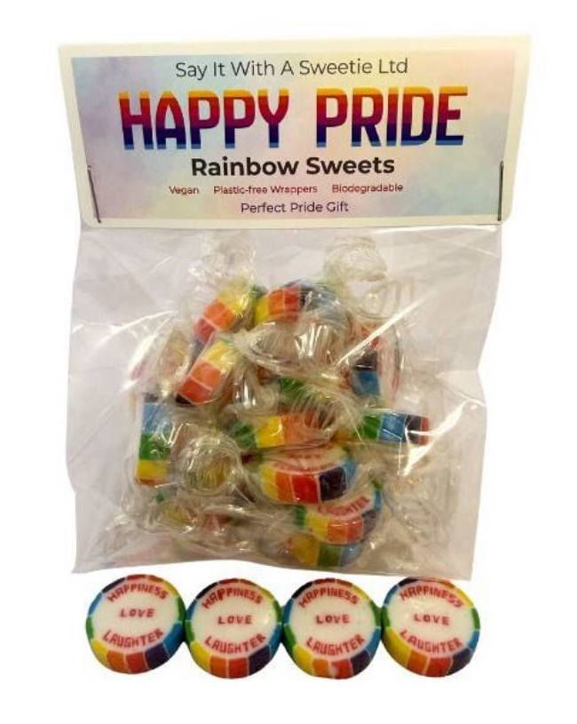 Each sweet features a vibrant rainbow design with PRIDE, LOVE or HAPPINESS LOVE LAUGHTER running through the centre.